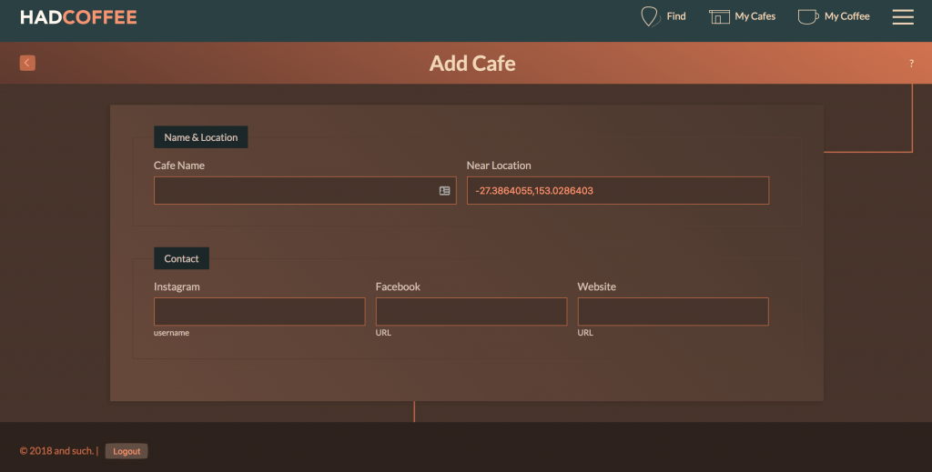 Backend dev has begun too; the Laravel backend started, user auth, and initial work on the process of adding cafes. That’s got a few extra steps than a basic CRUD form because I want to geolocate cafes without the user (or me) having to manually lookup their location.